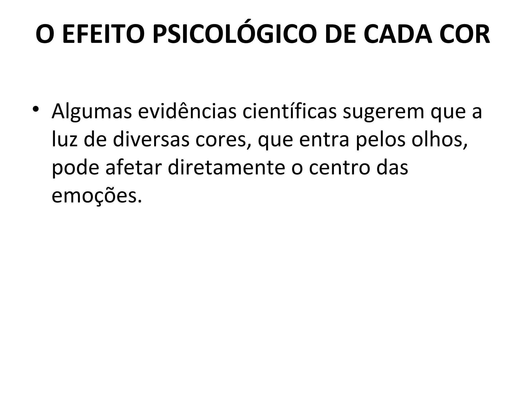 Algumas evidências científicas sugerem que a luz de diversas cores, que entra pelos olhos, pode afetar diretamente o centro das emoções. Cada um de nós responde à cor de uma forma particular. As pessoas tendem também a ser atraídas por certas cores, em virtude de alguns fatores determinantes.